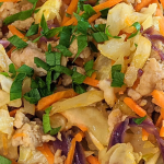 • Add the coconut aminos and let the recipe cook for 5-7 minutes until the coleslaw softens up a bit.