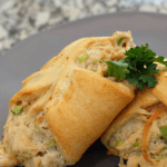 - Spoon some of the chicken mixture into the larger portion of each crescent roll and then roll them up.